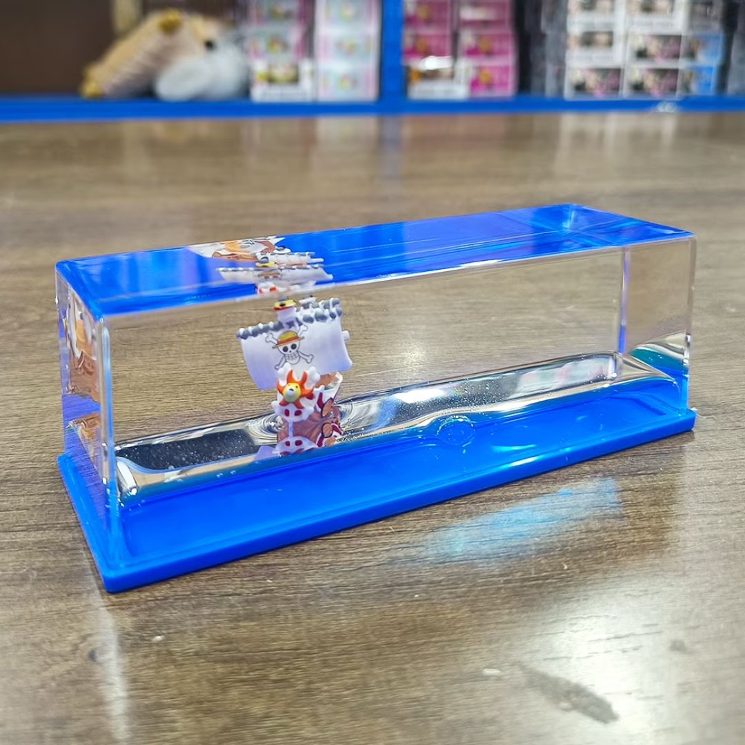 Just like the legendary ship itself, this miniature Thousand Sunny defies the odds. Securely nestled within a crystal-clear fluid-filled chamber, the ship gracefully bobs and drifts with even the slightest movement. No batteries required! The power of inertia ensures your Sunny will always be on the move, replicating the gentle sway of a ship on the open ocean.
