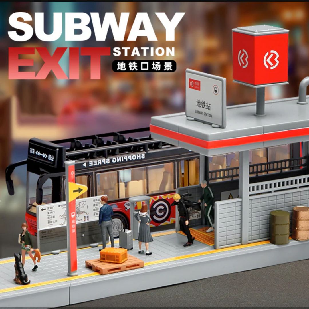 From the iconic SUBWAY EXIT signage to realistic platform textures, railings, street barrels, and commuter figures, this scene recreates the feeling of a bustling metro exit just as passengers step out into the city. The elevated structure, signage boards, and platform details make it an immersive display that feels straight out of a metropolitan street corner.