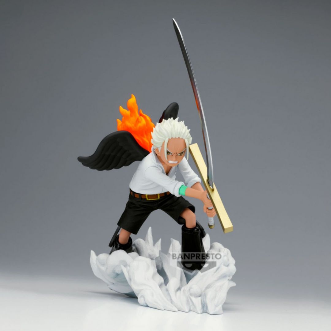 This figure features S-Hawk lunging forward with his massive blade, framed by dramatic cloud-burst effects underfoot, blazing flames behind him, and iconic black wings spread wide. The intense facial sculpt, sharp weapon detailing, and layered effect parts make this piece feel alive with motion—true to Banpresto’s Senkozekkei-S line known for high-impact battle moments.